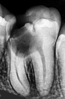 Infection in the lower molar causing intense pain and swelling. Root canal treatment was performed to save the tooth.