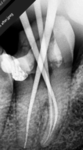 High-risk lower molar with severe infection treated successfully using advanced endodontic techniques.